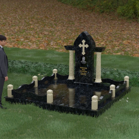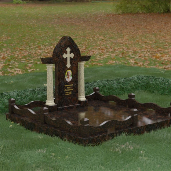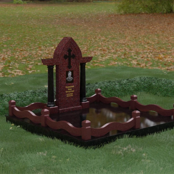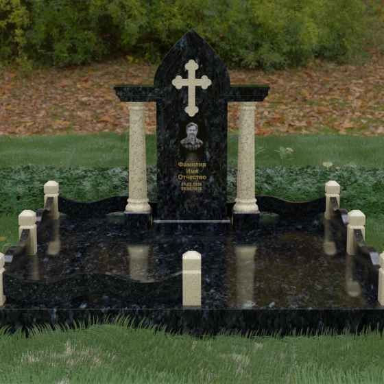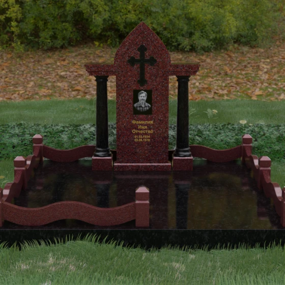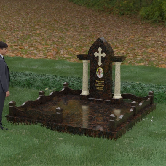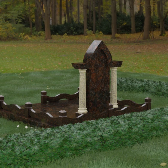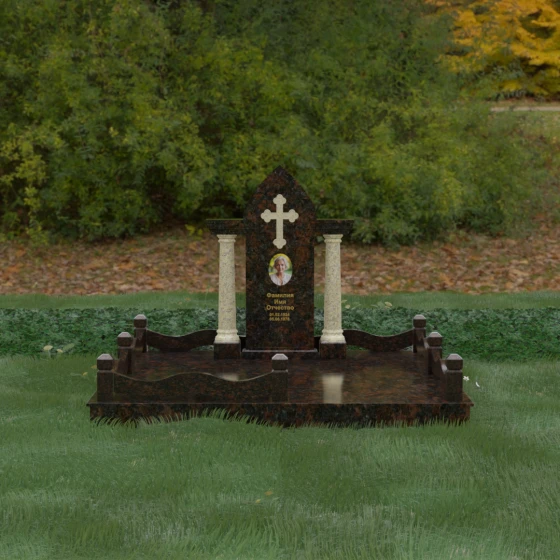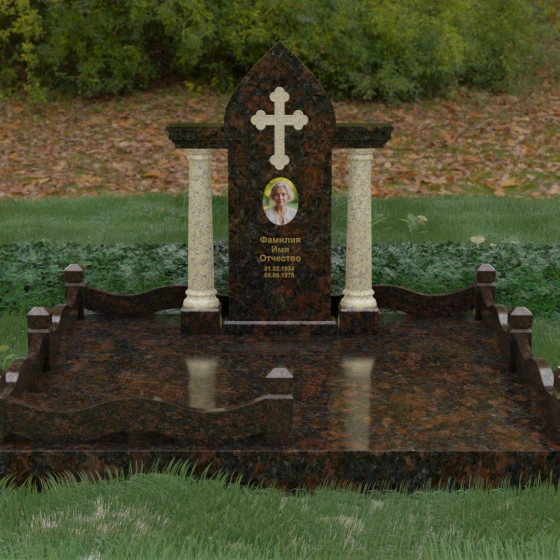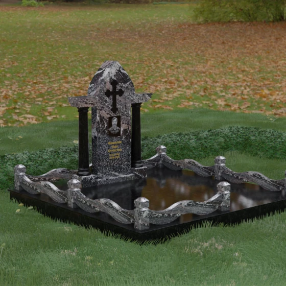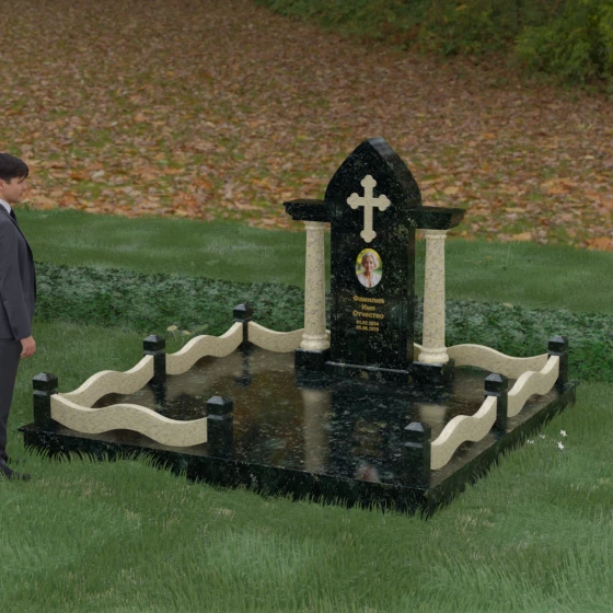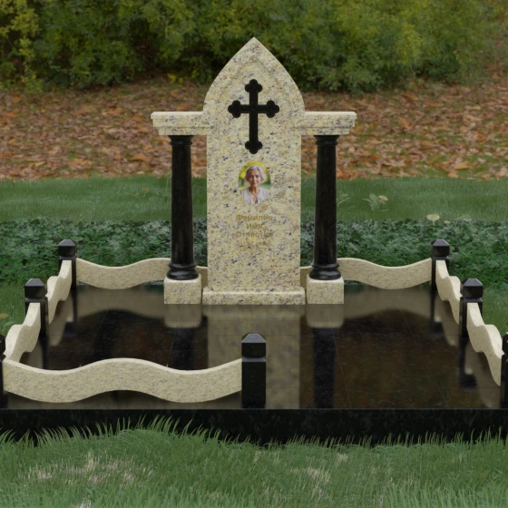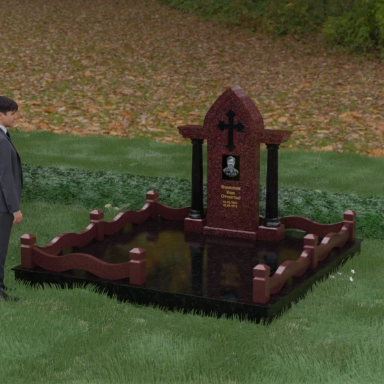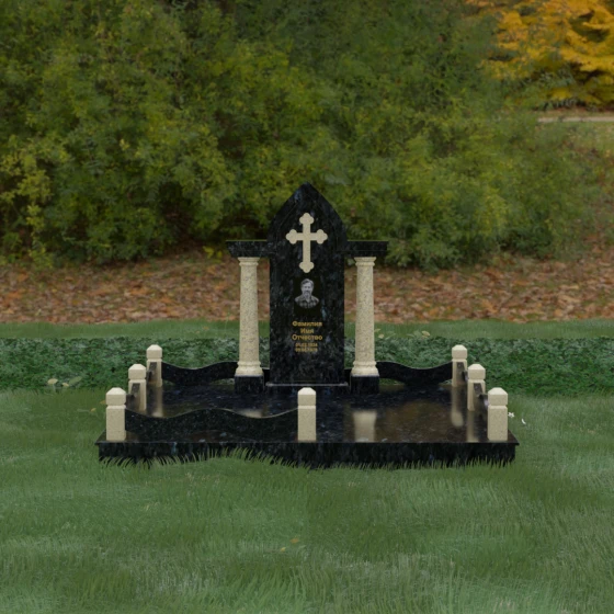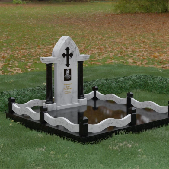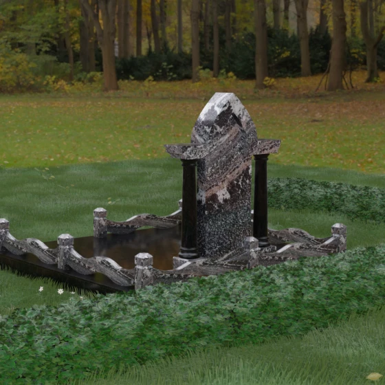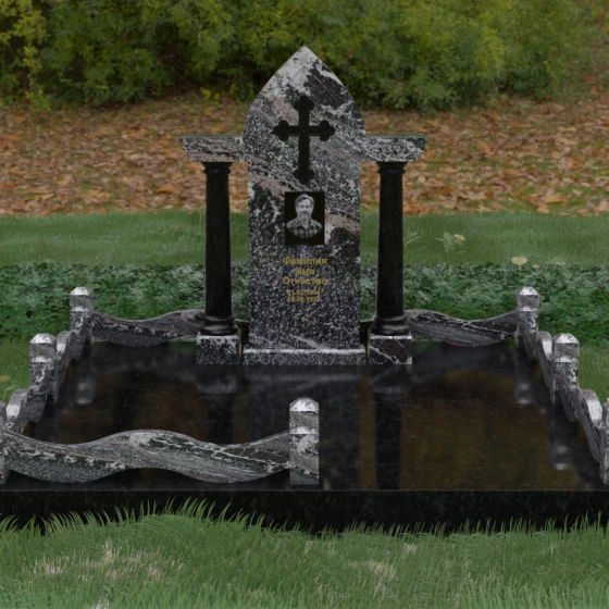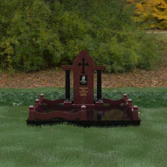 Кому подойдет: Этот мемориальный ансамбль является идеальным выбором для оформления женского захоронения — матери, супруги или дочери. Сочетание строгой формы часовни с изящными светлыми колоннами и волнообразным ограждением создает образ чистоты, любви и бесконечного уважения. Благодаря своей архитектурной сложности и возможности комбинирования цветов, данное изделие подчеркнет особый статус и значимость человека, став достойным воплощением вечной памяти в камне.