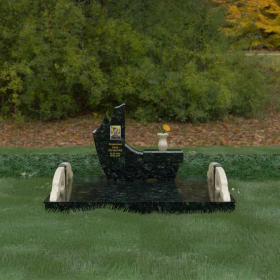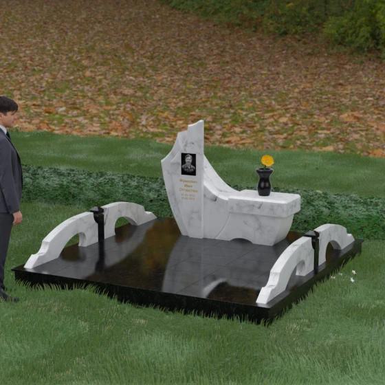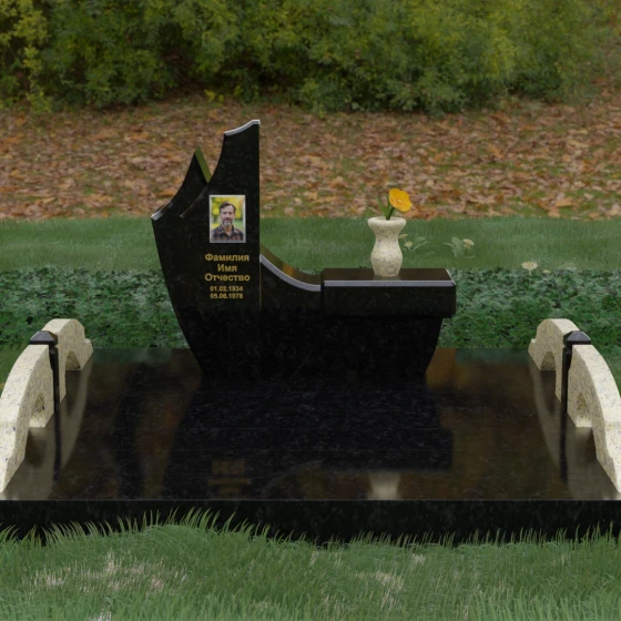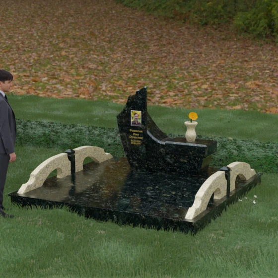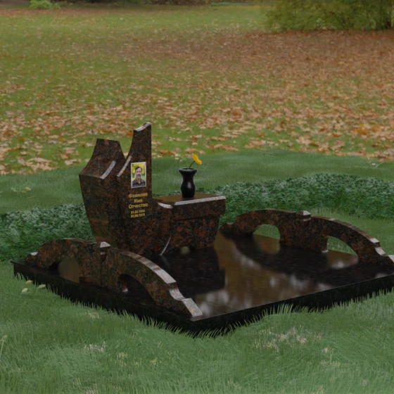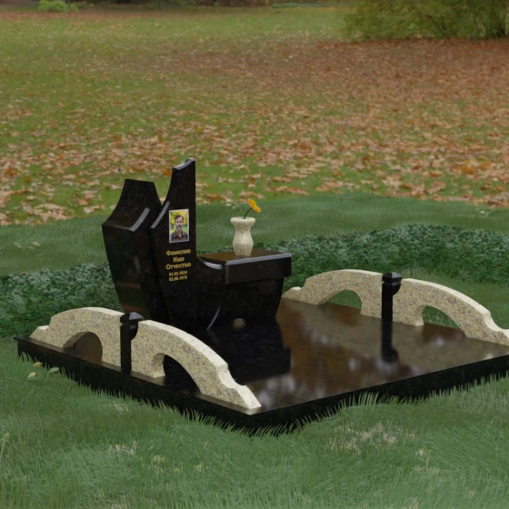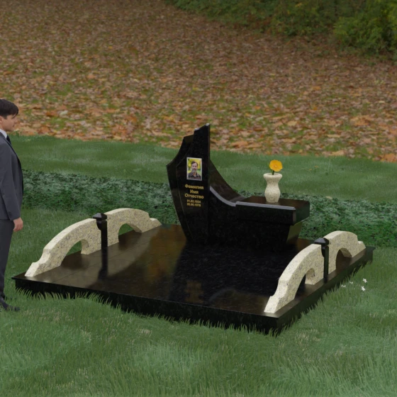 Особого внимания заслуживает комплексное благоустройство участка, входящее в концепцию данного мемориала. Вместо привычного открытого грунта здесь используется сплошное мощение массивными плитами, что обеспечивает не только величественный вид, но и исключительную чистоту: сорняки и грязь больше не будут беспокоить место памяти. По краям площадки установлены уникальные декоративные элементы — стилизованные каменные мостики или арки из светлого гранита, которые выступают в роли изящных ограничителей пространства. Завершает ансамбль точеная ваза из натурального камня, расположенная на специальном выступе основного изваяния, что создает единую, неразрывную художественную линию.