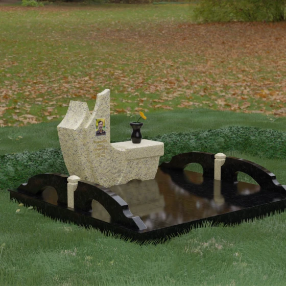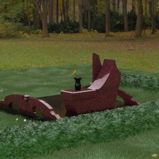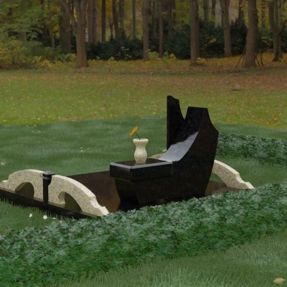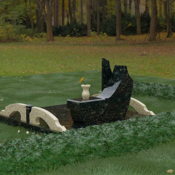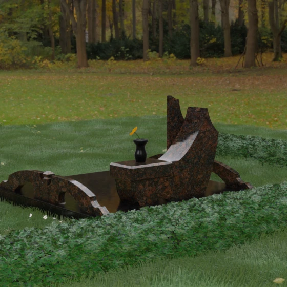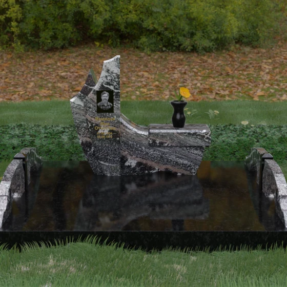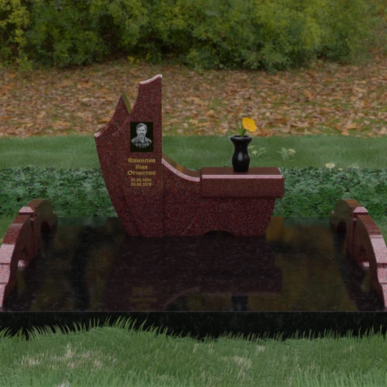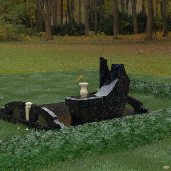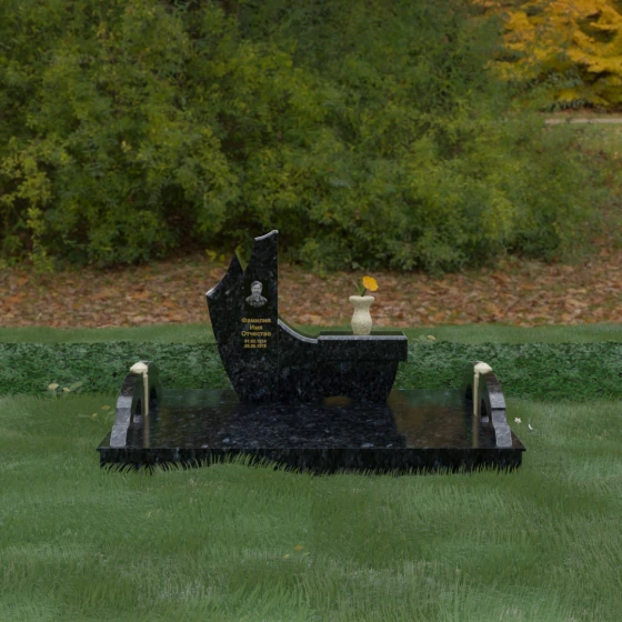 Данный гранитный монумент представляет собой эксклюзивное архитектурное решение, в котором безупречная геометрия встречается с плавностью природных линий. Дизайн центрального изваяния вдохновлен образом наполненного ветром паруса или застывшего пламени: левый край стремительно уходит вверх, образуя изящный остроконечный пик, в то время как правая сторона переходит в функциональную горизонтальную полку. Такая асимметрия позволяет создать динамичную композицию, притягивающую взгляд игрой света на зеркально отполированных поверхностях. Каждая грань здесь тщательно обработана, а фаски сняты таким образом, чтобы подчеркнуть монументальность камня и придать ему дополнительный визуальный объем.