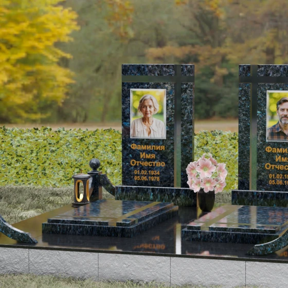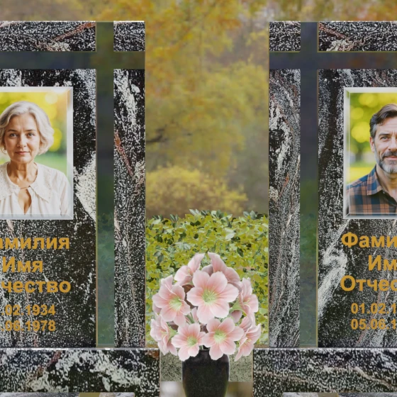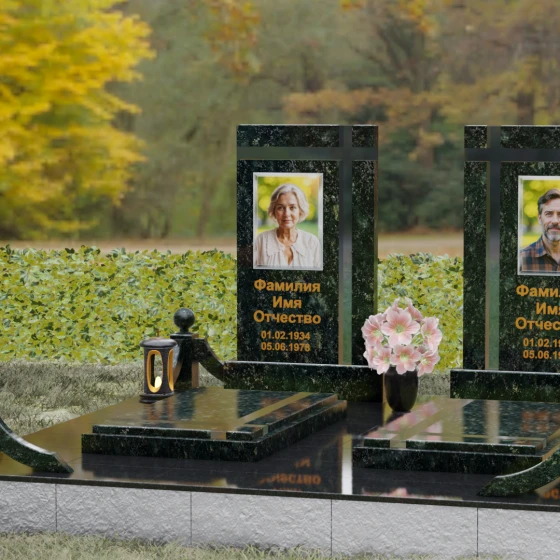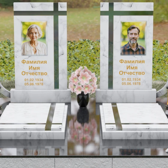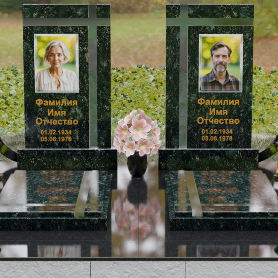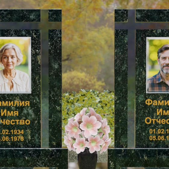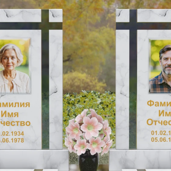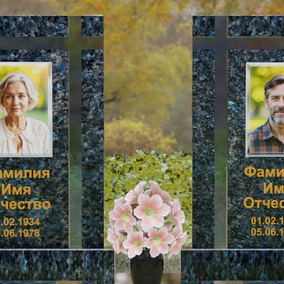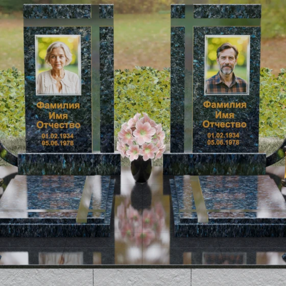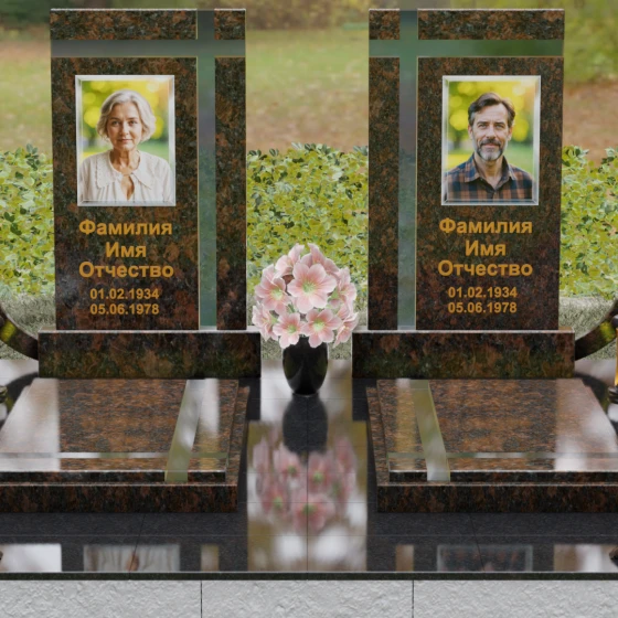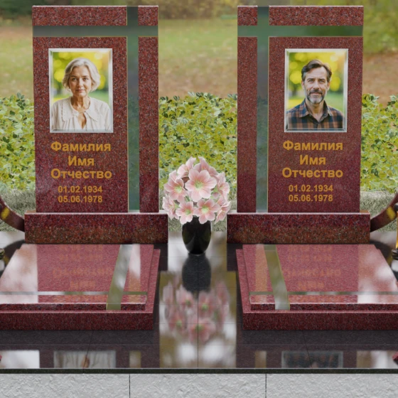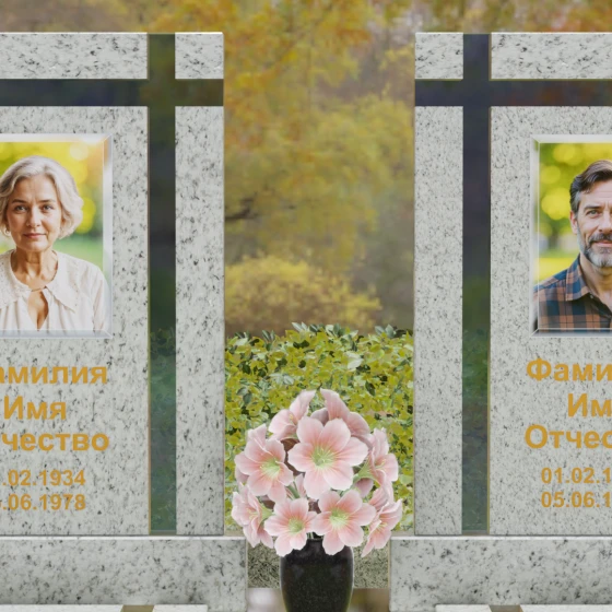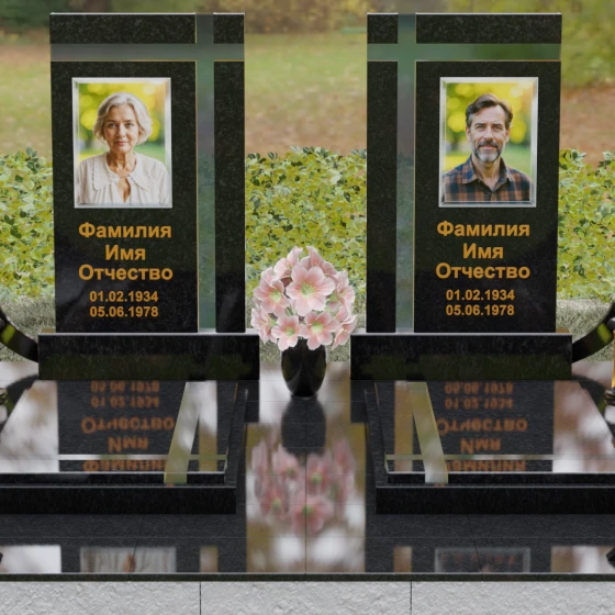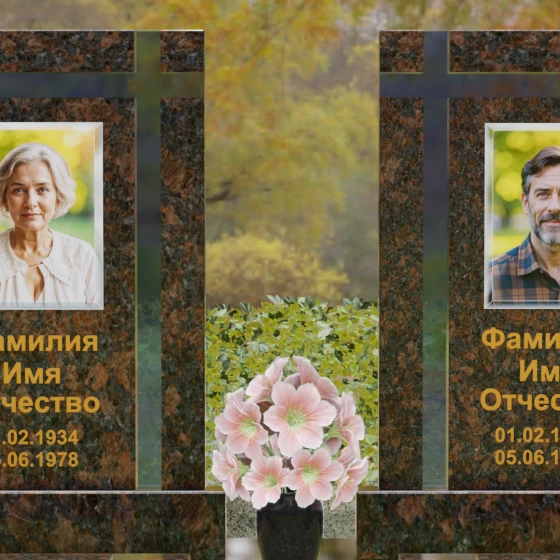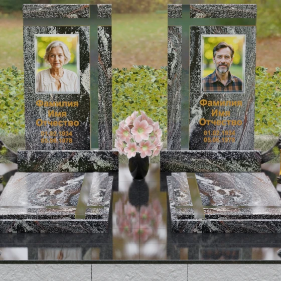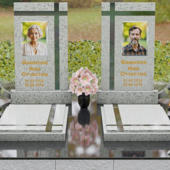 Оформление: Для данной модели идеальным решением станет гравировка портретов на керамических вставках или закаленном стекле, как показано в представленном проекте. Золочение букв при нанесении ФИО и дат жизни создаст благородный акцент, который будет гармонировать с любым выбранным оттенком камня, от светлого мрамора до темного гранита. Лаконичность форм позволяет сосредоточить всё внимание на лицах и именах, не перегружая восприятие лишними деталями.