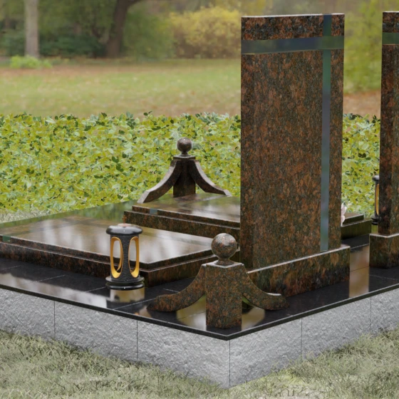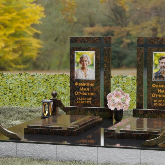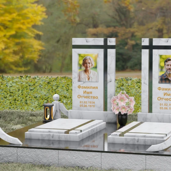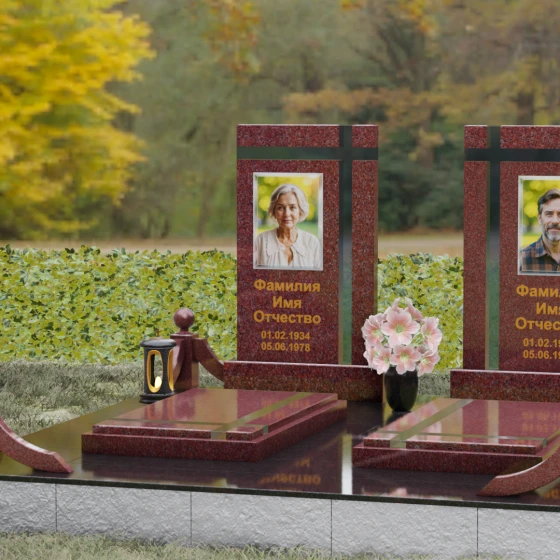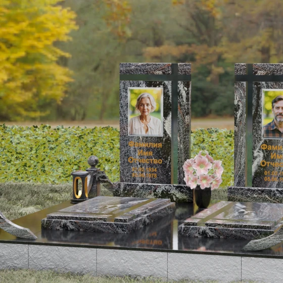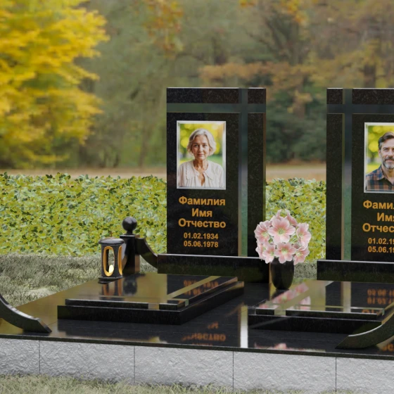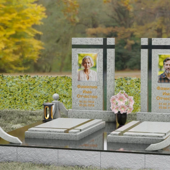 Данная величественная мемориальная композиция представляет собой не просто место упокоения, а подлинное произведение архитектурного искусства, призванное увековечить глубокую связь между двумя душами. Дизайн изделия строится на гармонии строгих вертикальных линий и изящных декоративных элементов, создавая атмосферу благородного спокойствия и вечного почтения. В центре ансамбля расположены две симметричные стелы, объединенные общим основанием, что символизирует неразрывность уз и жизненного пути, пройденного рука об руку. Особое внимание привлекает лаконичная резьба в верхней части плит: пересекающиеся глубокие борозды образуют строгий, геометрически выверенный крест. Этот символ веры и смирения не выступает отдельной деталью, а является неотъемлемой частью самого камня, подчеркивая монументальность и целостность всего надгробия.