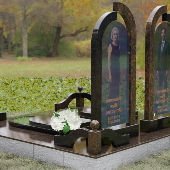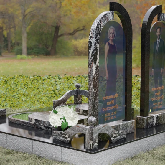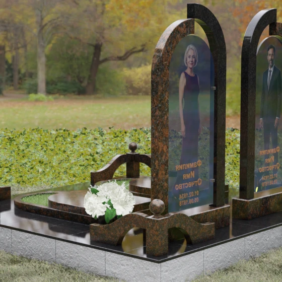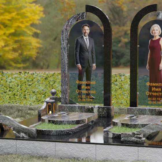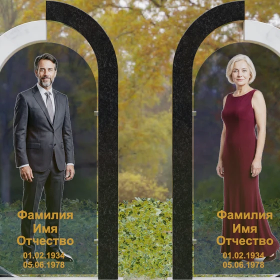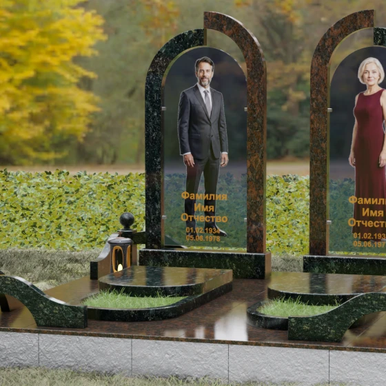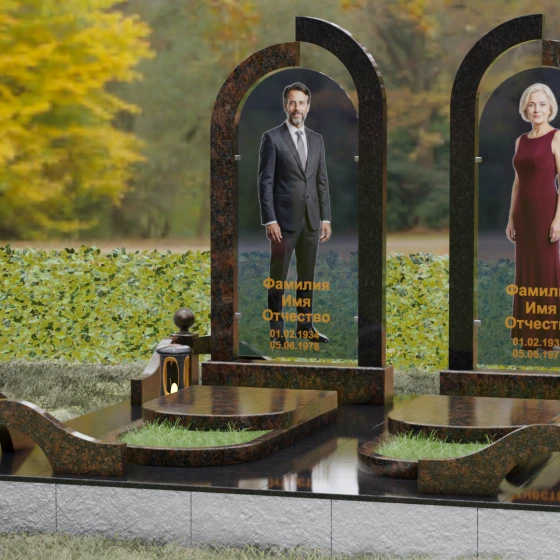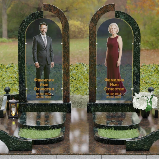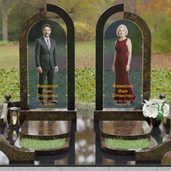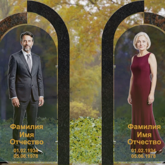 В основе композиции лежит классическая форма двойной арки, которая издревле символизирует небесный свод и переход в вечность. Две симметричные вертикальные стелы, объединенные общим основанием, образуют гармоничный дуэт. Каждая деталь здесь продумана до миллиметра: грани камня подвергнуты многоступенчатой обработке, что позволило добиться безупречной плавности линий. Внутреннее пространство арок заполнено панелями из закаленного стекла, на которых методом высокоточной печати нанесены полноростовые портреты. Особое внимание стоит уделить художественному фону, нанесенному непосредственно на стеклянную основу: мягкие очертания осеннего леса создают атмосферу умиротворения, не отвлекая внимания от главных образов.