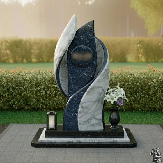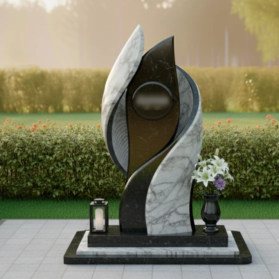 Полированная поверхность камня играет с солнечным светом, создавая мягкие блики и тени, подчеркивающие глубину и выразительность форм. Контраст темного и светлого камня усиливает визуальный эффект, делая памятник заметным и запоминающимся. Светлые элементы, выполненные из мрамора, символизируют чистоту и светлую память, а темные гранитные вставки- стойкость и вечность.