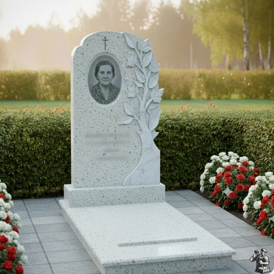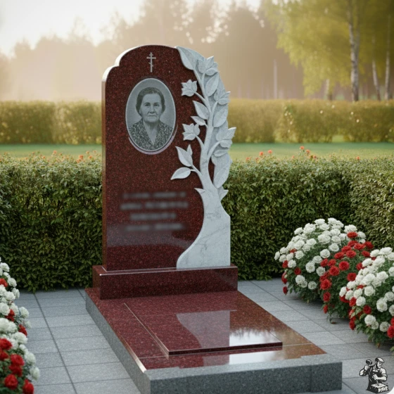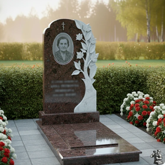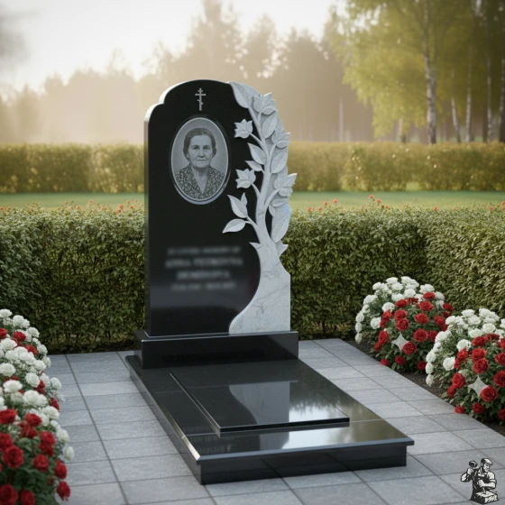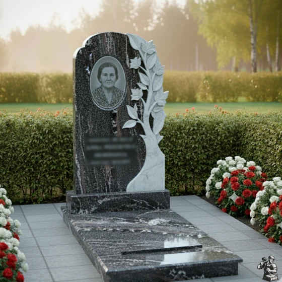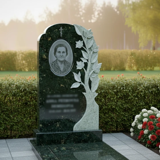 • Стела: Вертикальная плита с овальным завершением и плавным переходом к резному элементу "Древо Жизни". Круговая полировка придает камню зеркальный блеск.