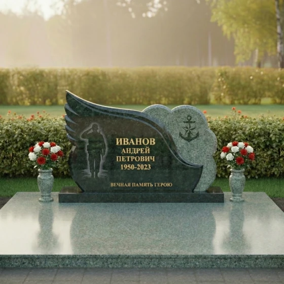 Центральная часть стелы представляет собой элегантную черную полированную поверхность, идеальную для нанесения портрета и данных усопшего. Здесь же, методом глубокой гравировки, прорисован силуэт воина, отдающего честь, что придает композиции особую торжественность и дань уважения. Правая часть стелы оформлена в виде облака с рельефным изображением якоря — символа надежды, верности и стабильности, часто ассоциирующегося с морской службой или жизненной стойкостью. Этот элемент выполнен из светлого, матового камня, создавая выразительный контраст с полированной черной основой и подчеркивая фактурное разнообразие материала.