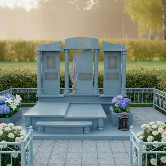 Представленное ритуальное изделие (Артикул 681) представляет собой не просто надгробие, а величественный мемориальный ансамбль, спроектированный по канонам классической храмовой архитектуры. В основе композиции лежит принцип триптиха: три вертикальные стелы объединены в единый портал, символизирующий вечный покой и неразрывную связь поколений. Центральная часть ансамбля увенчана изящной аркой с лаконичным православным крестом, выполненным в технике глубокой гравировки с последующим золочением. Главным художественным акцентом является барельефная резьба в виде зажженной свечи. Мастерски переданная пластика пламени создает удивительную игру контрастов: зеркально отполированная поверхность основного камня подчеркивает мягкую, матовую фактуру резного элемента, превращая холодный гранит в живой символ неугасимой души.