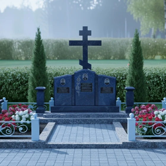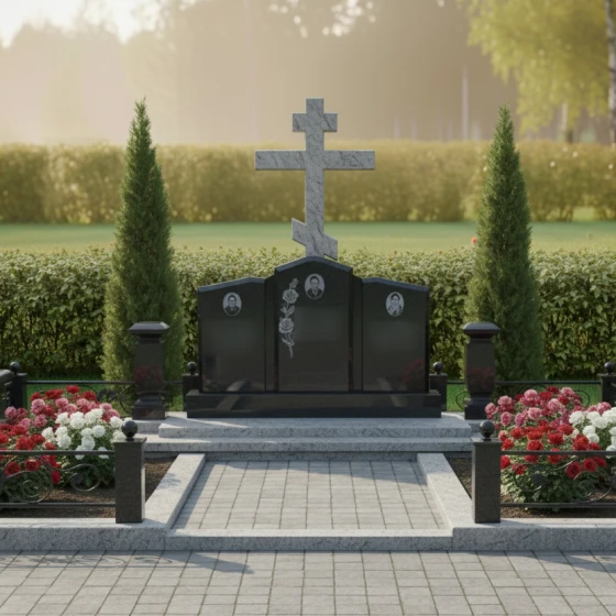 Кому подойдет: Данная мемориальная композиция является идеальным решением для семейного захоронения на три персоны. Благодаря своей трехчастной структуре и доминирующему православному кресту, она станет достойным символом вечной связи между супругами или родителями и детьми. Модель рекомендована тем, кто ценит каноническую строгость, надежность материалов и хочет обустроить участок в едином, законченном стиле, который не потребует реконструкции в течение многих поколений.