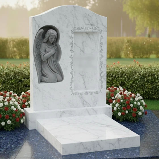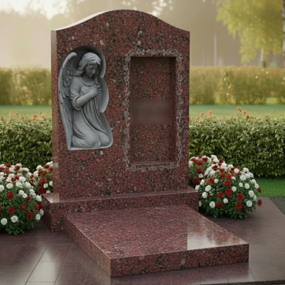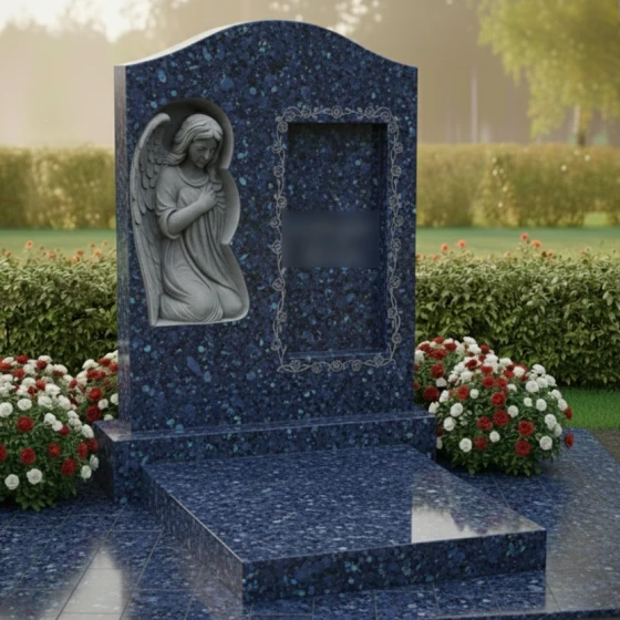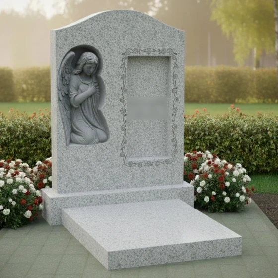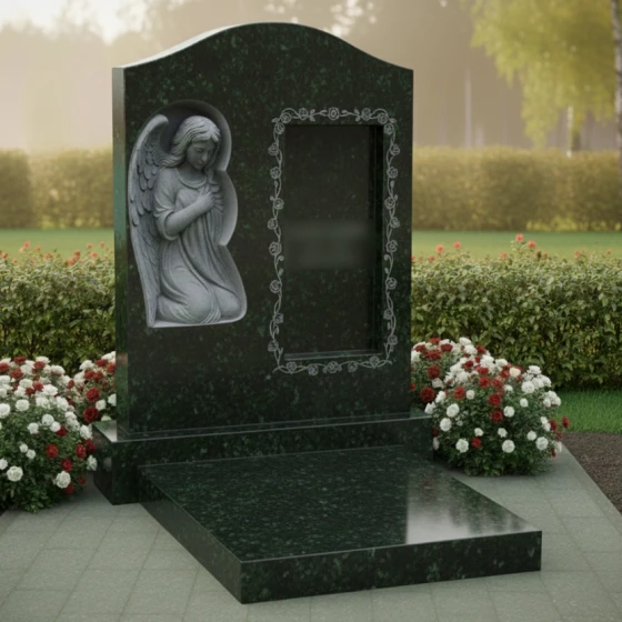 В левой части стелы расположен изящный барельеф, изображающий ангела с опущенной головой и сложенными в молитве руками. Крылья ангела аккуратно сложены, а его поза выражает смирение, скорбь и вечную молитву. Каждый завиток волос, каждая складка одеяния и каждое перышко на крыльях проработаны с исключительной тонкостью, передавая ощущение легкости и воздушности, несмотря на монолитность камня. Этот барельеф, выполненный в светлом, матовом оттенке, выделяется на фоне идеально отполированной черной поверхности, создавая эффект свечения и придавая композиции особую сакральность.