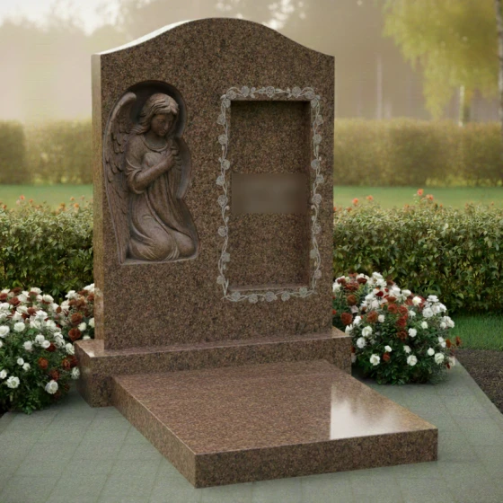 Справа от барельефа расположена прямоугольная рамка, предназначенная для портрета, обрамленная изысканным резным орнаментом. Этот орнамент, состоящий из переплетающихся растительных мотивов, придает рамке утонченность и завершенность, подчеркивая значимость изображения, которое будет помещено внутрь. Контраст между зеркальной гладкостью основной стелы и деликатной резьбой рамки и барельефа создает гармоничное сочетание различных фактур, делая это ритуальное изделие не просто надгробием, а произведением искусства.