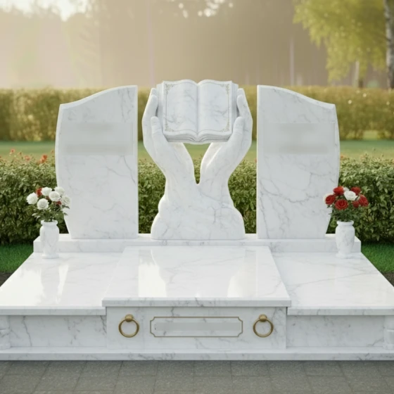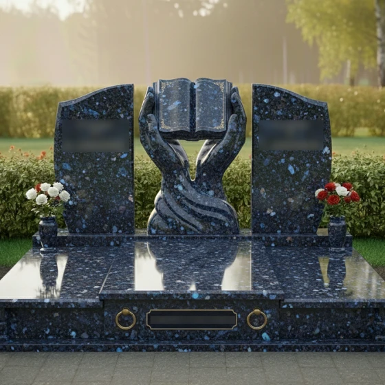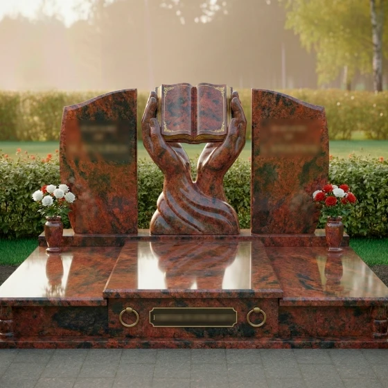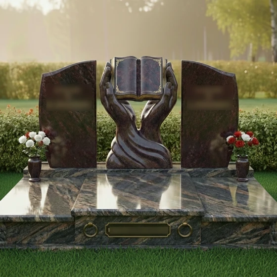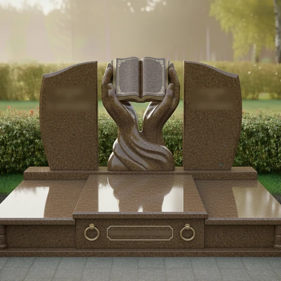 Каждая деталь этой модели пронизана глубокой философией. Руки символизируют бережную защиту, заботу и то, что душа усопшего находится в надежных объятиях вечности. Раскрытая книга — это классический символ прожитой жизни, «открытой главы» истории рода, мудрости и знаний, которые человек оставил после себя. Боковые плиты, обрамляющие центр, напоминают крылья или страницы, создавая ощущение завершенности и покоя. Отсутствие острых, агрессивных углов в верхней части памятника настраивает на смирение и умиротворение, подчеркивая светлый характер печали.