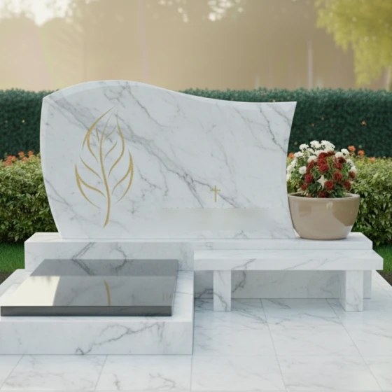 Модель мемориального комплекса под артикулом 705 — это результат кропотливой работы архитектора, стремящегося соединить монументальность природного материала с изяществом художественных линий. Главным акцентом композиции является асимметричная стела, верхняя грань которой выполнена в виде плавной, уходящей ввысь волны. Такая форма символизирует бесконечность жизненного цикла и покой. Левая часть монумента украшена глубокой художественной резьбой в виде стилизованного золоченого листа. Тонкая проработка каждой прожилки и мягкие изгибы резного элемента создают выразительный контраст с идеально гладкой, зеркально отполированной поверхностью основного камня. В центральной части стелы расположен лаконичный православный крест, выполненный в едином стиле с растительным орнаментом, что придает надгробию строгость и духовную завершенность.