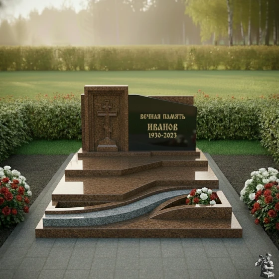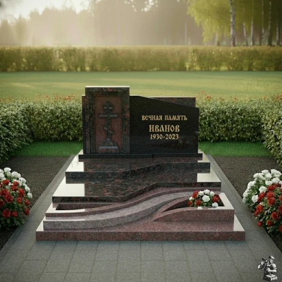 Особого внимания заслуживает многоуровневое благоустройство участка. Вместо привычного открытого грунта используется система каскадных плит, которые полностью закрывают место захоронения. Это не только придает ансамблю законченный, благородный вид в европейском стиле, но и значительно упрощает уход. Ступенчатый цоколь создает ощущение мощи и незыблемости. Изюминкой композиции выступает волнообразная вставка из серого гранита, которая словно лента времени прорезает черные ступени основания, смягчая строгость геометрии и внося в эстетику камня живую динамику. Интегрированный в основание цветник в форме остроугольного лепестка позволяет деликатно добавить живые растения, не нарушая общую монументальную гармонию.