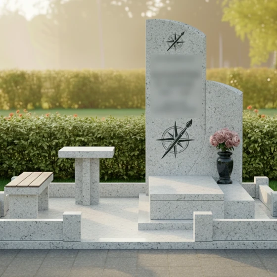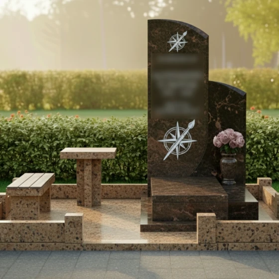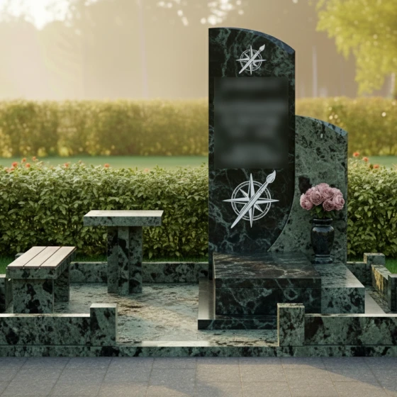 Представленное надгробие из натурального камня (модель 714) — это не просто памятный знак, а гармоничный архитектурный ансамбль, выполненный в современном европейском стиле. Композиция поражает своей лаконичностью и глубоким символизмом. Центральным элементом является вертикальная стела асимметричной формы: левая грань сохраняет строгую вертикаль, в то время как правая плавно уходит в изящный дугообразный изгиб. Эта мягкая волна придает массивному камню визуальную легкость и одухотворенность. Зеркальная полировка основной поверхности создает глубокий блеск, в котором отражается вечность, контрастируя с тонкой художественной гравировкой. На стеле дважды запечатлен уникальный символ — стилизованная роза ветров, совмещенная с кистью художника. Эти детали, выполненные с ювелирной точностью, подчеркивают творческую натуру и многогранность личности ушедшего человека, его стремление к поиску своего пути и созиданию.