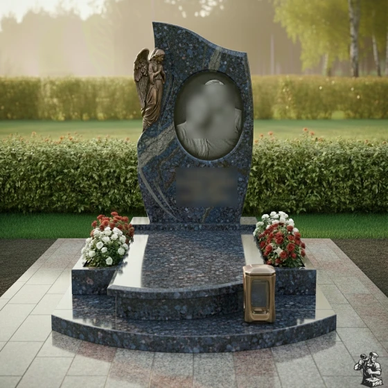 Стела этого изделия приковывает взгляд своей необычной асимметричной геометрией. Верхний край выполнен в форме плавной, уходящей ввысь волны, что придает тяжелому камню легкость и динамику. Одной из ключевых художественных деталей является барельеф молящегося ангела, расположенный на левом торце стелы. Тщательная проработка каждого пера в крыльях и складок одеяния небесного покровителя создает ощущение объема и одухотворенности. Центральную часть композиции занимает овальная ниша под портрет, обрамленная аккуратной фаской, что позволяет сделать акцент на образе дорогого человека. Зеркальная полировка основной поверхности камня контрастирует с детализированной бронзовой или матовой фактурой фигуры ангела, создавая глубокую игру света.