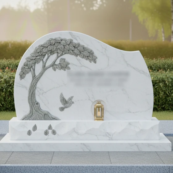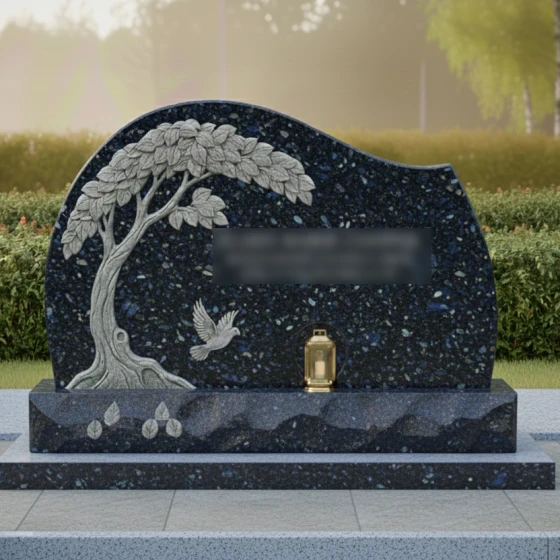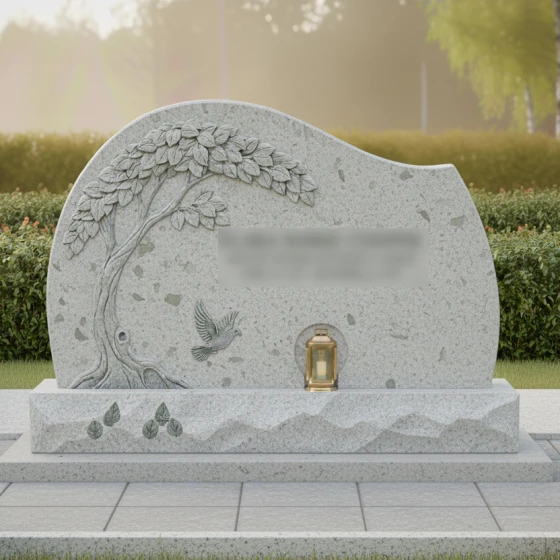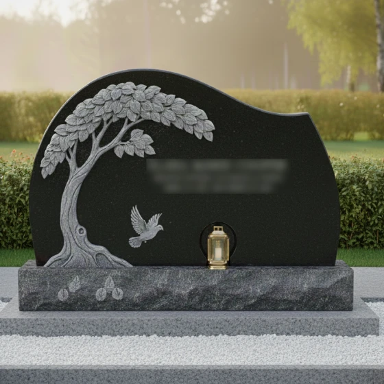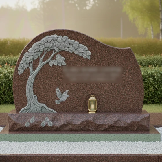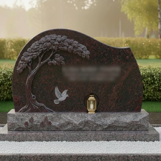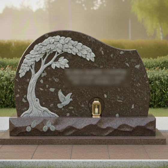 Данная мемориальная композиция представляет собой истинное произведение ритуального искусства, где холодный камень оживает под резцом опытного мастера. Центром художественного замысла является барельеф раскидистого дерева, чьи ветви, усыпанные детально проработанными листьями, нежно обрамляют стелу. Каждая прожилка на листе, каждый изгиб мощного ствола и выступающие корни выполнены с поразительной точностью, создавая эффект объема и природной грации. Ниже, под сенью резной кроны, запечатлен голубь в полете — символ чистоты души и вечного мира. Форма стелы лишена острых, агрессивных углов; ее верхний край образует плавную, асимметричную волну, напоминающую линию горизонта или спокойный изгиб холма, что придает всему ансамблю умиротворенный и гармоничный вид.