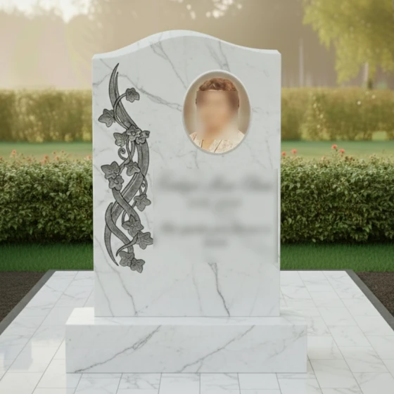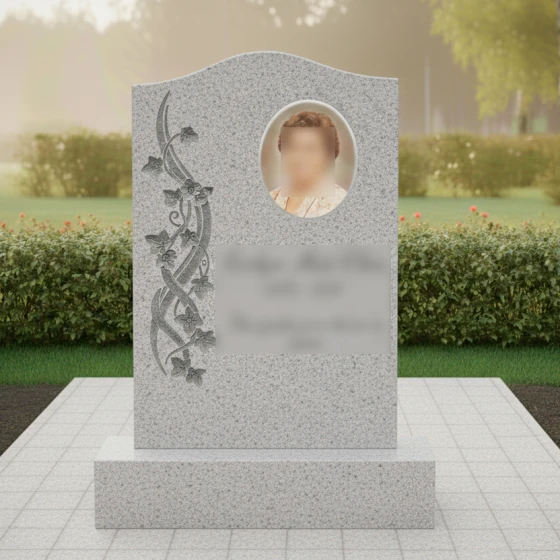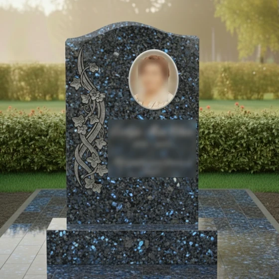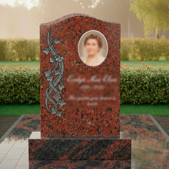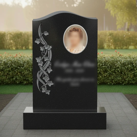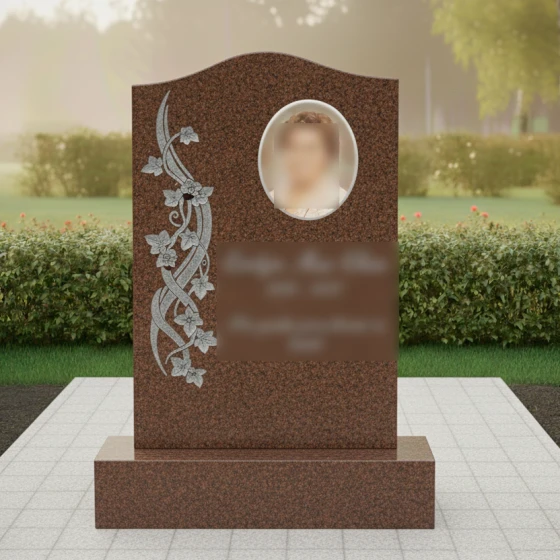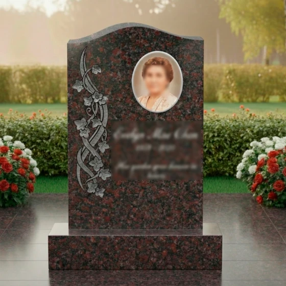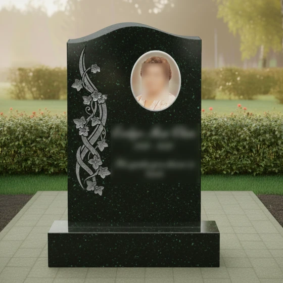 Данная модель памятника (Артикул 734) — это воплощение элегантности и глубокого уважения к памяти близкого человека. Главная особенность стелы заключается в её асимметричном исполнении: верхняя грань оформлена в виде мягкой, плавной волны, которая лишена острых углов, что придает монументу одухотворенность и легкость. Надгробие из натурального камня притягивает взгляд виртуозной художественной резьбой, расположенной вдоль левого края. Здесь мастера-камнерезы запечатлели в граните изящную вьющуюся ветвь плюща. Каждый лепесток цветка и прожилка на листьях выполнены с ювелирной точностью, создавая объемный барельеф, который кажется живым. Контраст между зеркально отполированной черной поверхностью стелы и светлой, бархатистой фактурой резных элементов создает неповторимую игру света и тени. В солнечный день полировка отражает окружающий мир, а матовая резьба словно светится изнутри, подчеркивая монументальность и эстетическую завершенность композиции.