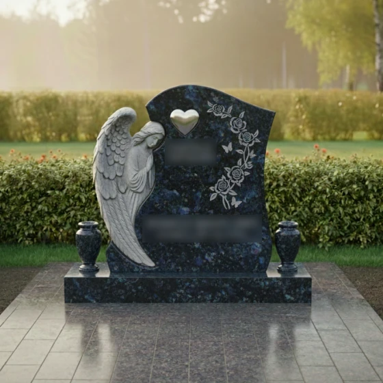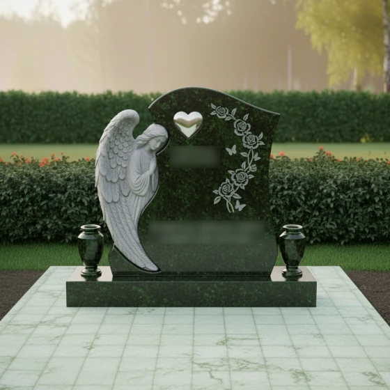 Центральное место в композиции занимает вертикальная стела со сложной комбинированной резьбой. Левая грань монумента представляет собой высокохудожественный барельеф скорбящего ангела. Мастерски исполненная фигура небесного покровителя склонена в смиренной молитве, а его крылья, детально проработанные в камне, словно обнимают плиту, создавая атмосферу защиты. Резьба выполнена с особым вниманием к деталям: каждое перо крыла имеет выраженный объем и фактуру, что создает эффектный контраст с идеально гладкой, зеркальной поверхностью основной части камня.