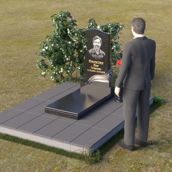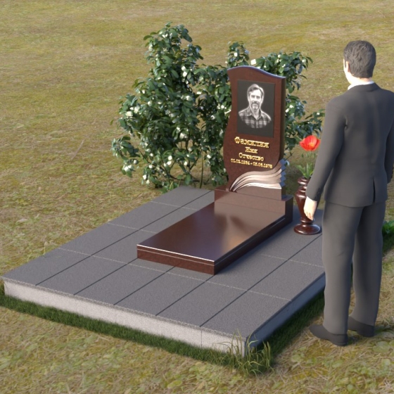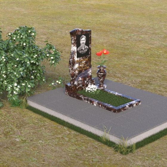 Надгробие из натурального камня ПВ 111 представляет собой элегантную композицию, где плавные линии и строгие формы гармонично сочетаются. Стела имеет форму, напоминающую раскрытую книгу, страницы которой плавно переходят одна в другую, создавая ощущение легкости и устремленности ввысь. Верхняя часть стелы, обрамляющая портрет, имеет скругленные углы и мягкий, волнообразный абрис, словно нежные объятия. Боковые грани стелы искусно обработаны, создавая игру света и тени, подчеркивающую благородство материала. В нижней части памятника расположен декоративный элемент в виде волны, выполненный в светлом тоне, что создает контраст с полированной поверхностью стелы и добавляет композиции динамики. Подставка под стелу выполнена в виде прямоугольной плиты с полированными фасками, что придает ей законченный и элегантный вид.